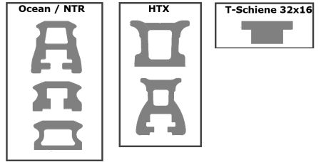 Lewmar liefert derzeit noch Wagen und Endstücke für 3 verschiedene Schienenprofile, Querschnitte siehe Bild rechts. Das Ocean System (Gr. 1, 2 & 3 Produktion ca. 1992 - 2005) und das NTR System (Gr. 1, 2 & 3 ab ca. 2005) verwenden die gleichen Schienen, einziger Unterschied ist die Farbe (Ocean = grau, NTR = schwarz).